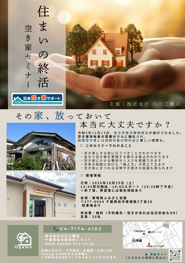 千葉県の空き家サポーター®「株式会社小川工務店」主催の住まいの終活セミナーにて、弊社の執行役員 小川 晃彦が講演いたしました。